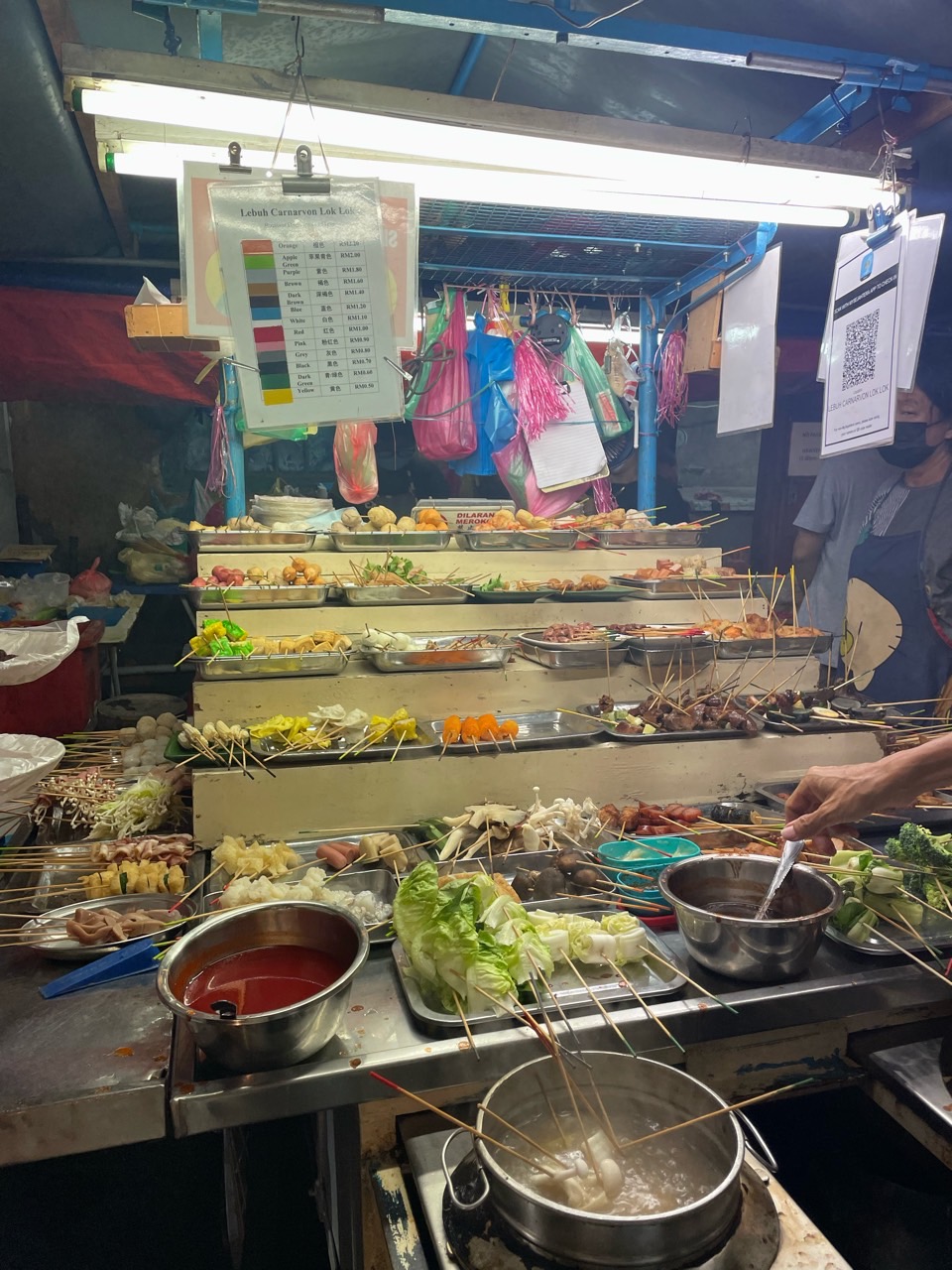 자세히 보시면 꼬치 끝부분에 색이 입혀져 있는데 색마다 가격이 달라요. (왼쪽 사진 위쪽에 메뉴판이 찍혀있네요!)