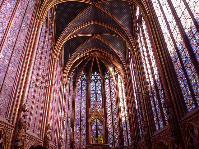 생트 샤펠 성당은 고딕 양식으로 지어진 건물로, 내부에는 천 개가 넘는 유리 모자이크로 가득한데 그게 호화로운 장식의 보석상자를 연상시켜 '파리의 보물'이라고도 불리는 성당입니다.